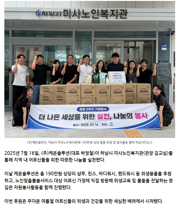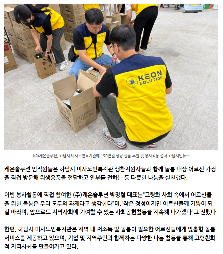 (주)케온솔루션하남시 미사노인복지관에 190만원 상당 물품 후원 및 봉사활동 펼쳐-어르신 가정 직접 방문해 따뜻한 나눔 실천https://blog.naver.com/msc1964/223936140696