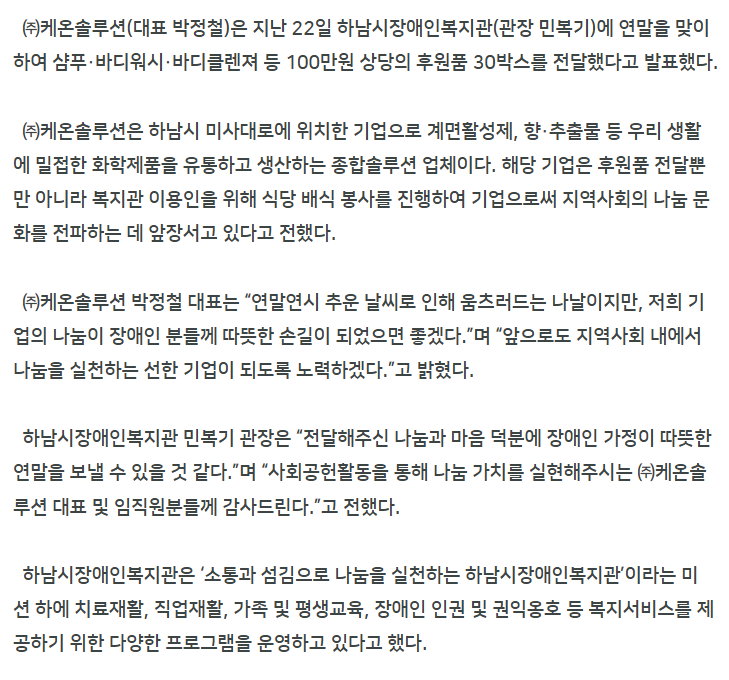 하남시장애인복지관에 샴푸.바디워시 등 후원품 30박스 전달